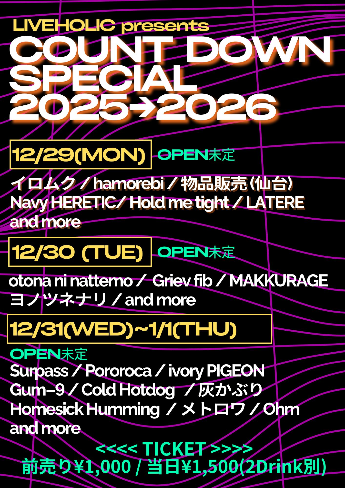 2025.12.31(水)LIVEHOLIC presents COUNT DOWN SPECIAL 2025→2026■場所: 下北沢LIVEHOLIC■OP/ST: TBA / TBA■ADV/DOOR: ¥1000… 続きを読む 12/31(水) 下北沢 LIVEHOLIC presents COUNT DOWN SPECIAL 2025→2026